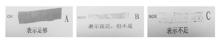 達(dá)因筆在材料表面上的擴(kuò)散程度是由材料表面的清潔程度所決定的。材料表面的清潔程度如圖A中所示,材料表面沒有雜質(zhì),達(dá)因筆在材料表面涂抹后易流動和擴(kuò)散,并涂滿了材料表面不平的表面。而在圖BC中,由于材料表面有雜質(zhì),達(dá)因筆涂抹后并不能和材料表面完全重合, 材料表面留有一定的空穴,達(dá)因筆在材料表面難以擴(kuò)散。由于材料表面的清潔程度不同,達(dá)因筆與材料表面接觸的面積就不同,利用涂抹的面積大小就能檢測出材料表面的清潔程度,使用達(dá)因筆檢測是間接量化材料表面潔凈程度和表面處理效果的檢測方法。